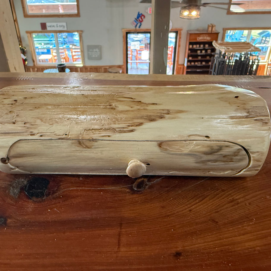 This medium sized Amish-made cedar jewelry box features a beautifully smooth, rounded log design made from locally sourced Kentucky cedar. Its single wide drawer opens with an easy-to-grip wooden knob and is lined with soft velvet to protect your keepsakes. The natural cedar grain and warm tones make every box one of a kind. Perfect for storing larger jewelry pieces or keepsakes, this handcrafted box brings rustic charm and lasting quality to any home.