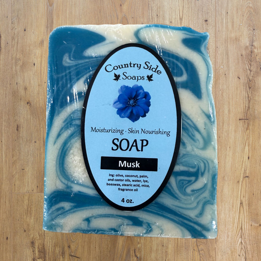 A classic, clean scent with a touch of warmth, this all-natural Musk soap nourishes and hydrates your skin while leaving behind a subtle, long-lasting fragrance. Its creamy lather and elegant blue-and-white swirl make every wash feel refreshing and refined.